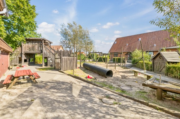 Udenomsarealer omfatter asfalteret skolegård, legeplads, tipi, diverse legehuse, fodboldbane.