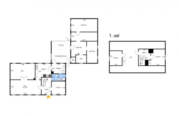 På første sal findes to værelser og en stor repos, som eventuelt kan indrettes som hjemmekontor, ekstra værelse eller opholdsrum. Der er også mulighed for at åbne op til kip og fremhæve de gamle spær – en løsning, der kan give huset et lyst og moderne udtryk.