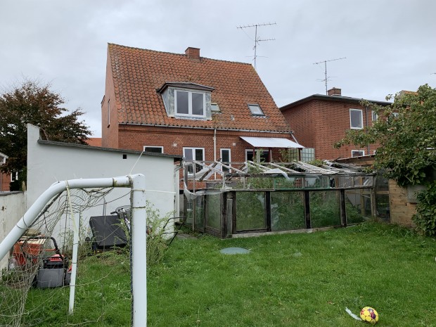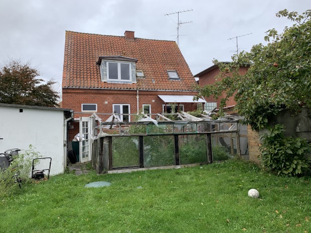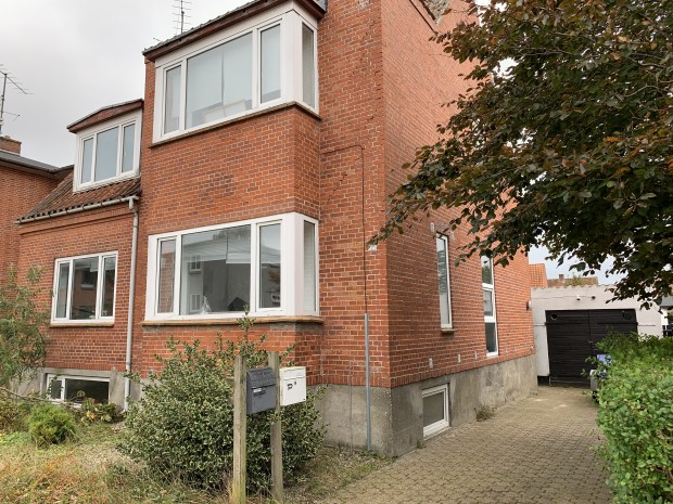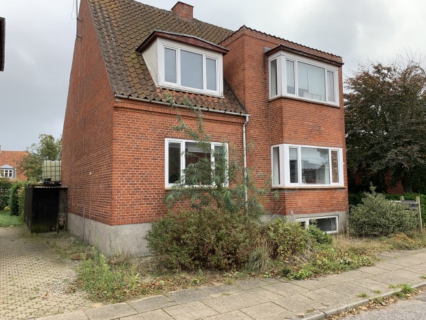 Rødstens ejendom med tegltag, opført i 1935, med et ifølge BBR samlet boligareal på 160 m². Boligen er indrettet med 2 selvstændige lejligheder. Lejligheden i stueetagen er på 85 m², der er indrettet med entre m/trappe til 1. sal, værelse, gang, stue med trægulv, brændeovn, bue til spisestue, nyere lyst køkken, toilet samt soveværelse m/udgang til terrasse. Lejligheden på 1. sal er på 75 m², heraf 10 m² adgangsareal, der er indrettet med repos, nyere lyst køkken, stue, toilet, soveværelse samt værelse. Lyse trægulve samt plastvinduer (heraf et utæt). Tillige kælder på 86 m², der er indrettet med vaskerum, gang samt 4 disponible rum. Ejendommen trænger til vedligeholdelse. Der er revnedannelser i murværk samt fugtproblemer. Hele ejendommen er udlejet samlet til en månedlig husleje af kr. 6.000,00 + forbrug. Opvarmning med fjernvarme. Tillige garage, opført i 1953, med et bebygget areal på 20 m².