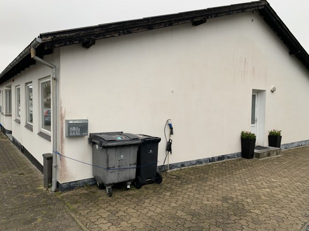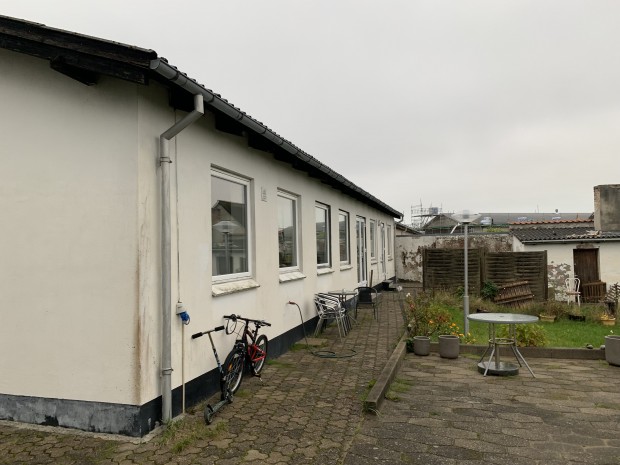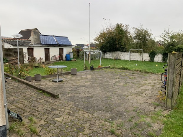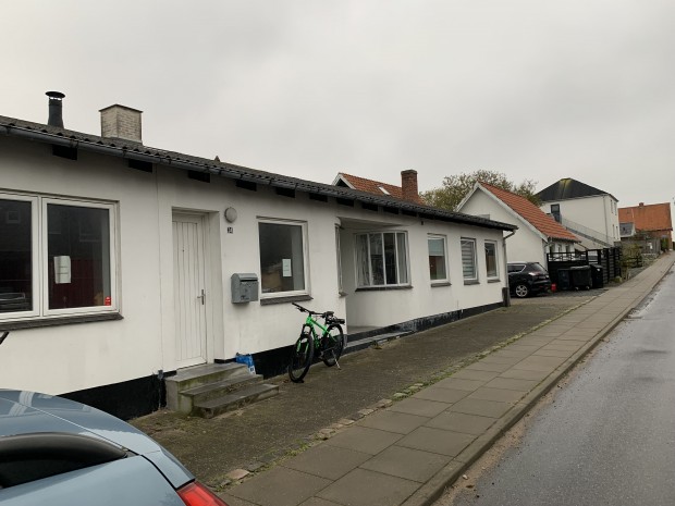 Lejligheden til venstre har et boligareal på 95 m2, og er indrettet med entre, køkken, badeværelse, stue m/udgang til haven, soveværelse samt værelse. Lejligheden bebos af ejer. Tillige udhus, opført i 1959, på 25 m2. Fælles lukket have m/terrasse. Ejendommen, der trænger til vedligeholdelse, opvarmes ved fjernvarme.