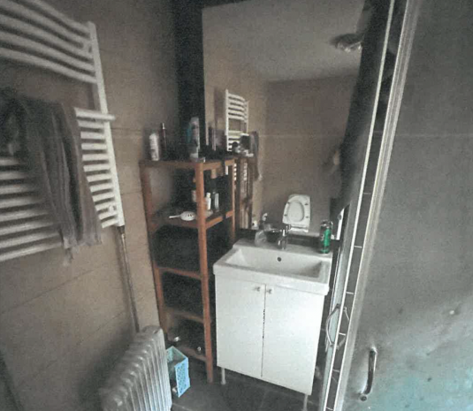 Værelset i stueetagen er med gråt gulvtæppe og træloft. Badeværelset med grå klinker og hvidt loft. I badeværelset er der toilet, bruseniche, håndklædetørrer og håndvask med hvide underskabe med plastgreb.