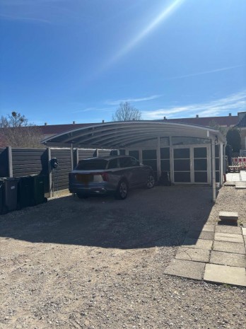 Ejendommen har forhave og indgangsparti med parkeringsplads og carport, som er anlagt i skel mod nr. 3.