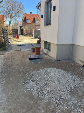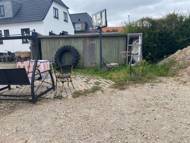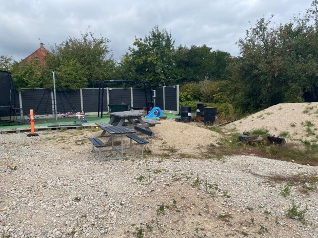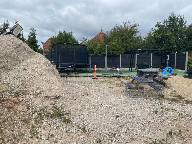 Der mangler belægning omkring ejendommen, og der er større jordbunker på grunden. Bagerst i haven er der etableret en legeplads med underlag og legestativ. Der er ikke opsat hegn mod naboejendommen, hvor der i stedet er opsat afspærring som følge af et større hul på nabogrunden.