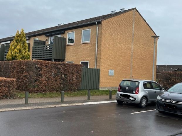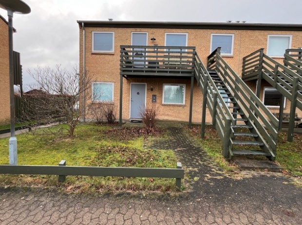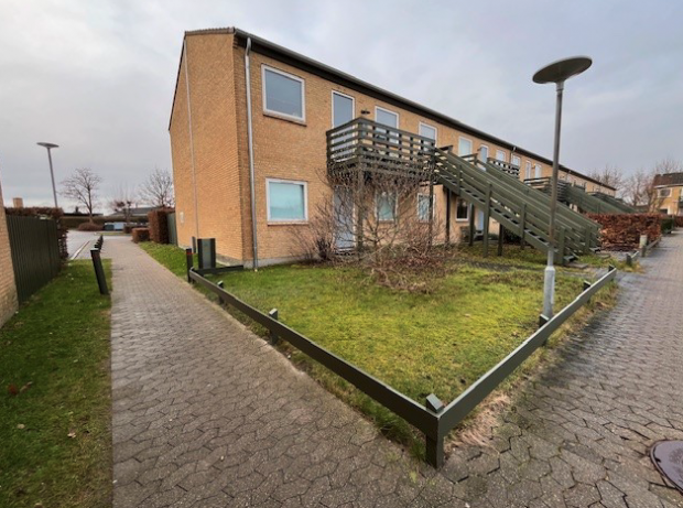 Lejligheden er en del af en bebyggelse fra slutningen af 80’erne. Ydervægge af mursten, tagdækning beton-tagsten. Have med stenbelagt terrasse og markise. Forhave med adgang til hoveddør og entre.