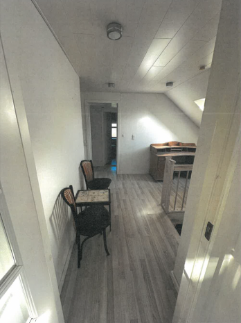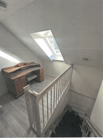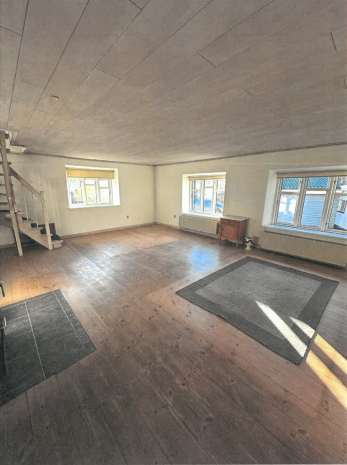 I hjørnet af stuen er trappen til 1. sal placeret. Trappen fører op til reposen, som er med lyst trægulv og hvidt træloft. Til venstre for reposen er stuen/været på 1. sal placeret. Stuen/værelset er med hvidt træloft