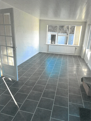 Overfor køkkenet er de to stuer placeret. Den ene stue er med hvidt træloft og laminat i sort klinkelook. Fra denne stue er der adgang til den fliseanlagte terrasse med udsigt til Roum Bæk.