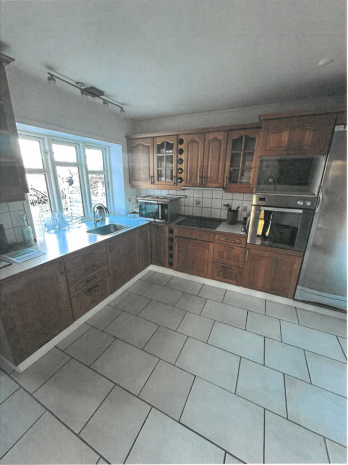 Bevæger man sig længere ned af gangen kommer man til ejendommens køkken. Køkkenet er med fronter i trælook med udskæringer samt lys bordplade. Køkkenet er med lyse klinker samt hvidt loft. I køkkenet er der hvidevarer i form af mikroovn, emhætte, ovn, køleskab og kogeplade. Bag køkkenet er der et mindre køkken / bryggers. Der er skabsplads med hvide fronter med stålgreb. Der er gulvbeklædning i form af laminat med sort klinkelook. Derudover er der en opvaskemaskine og et fryseskab.