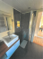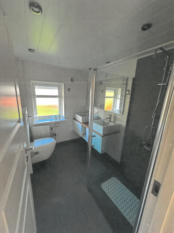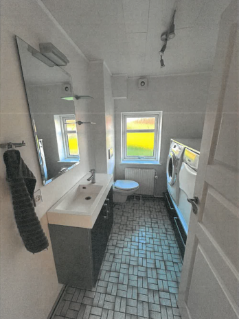 Fra ejendommens hovedindgang kommer man ind i en entre og gang med lyst træloft og brunlig melerede klinker på gulv. Fra entreen og gangen er der adgang til værelset i stueetagen. Værelset er med hvidt loft samt trægulv. Ved siden af værelset er badeværelset placeret. Badeværelset har små hvide/brunlige melede fliser samt hvidt loft. I badeværelset er der håndvask med underskabe med grå fronter, bruseniche, toilet. Derudover er der en vaskemaskine og tørretumbler.