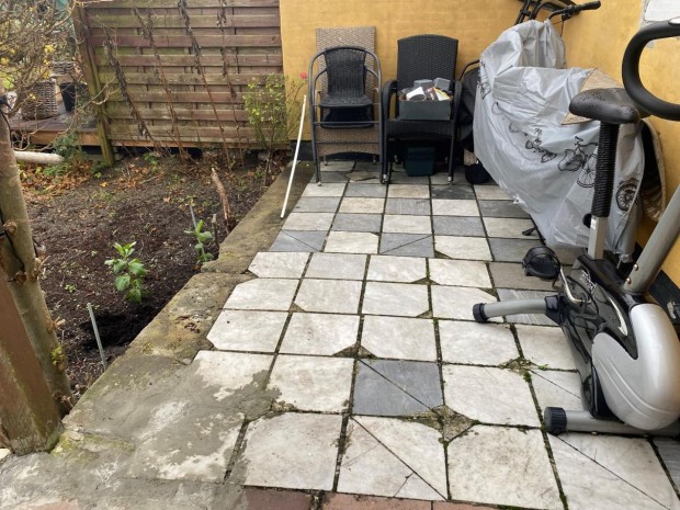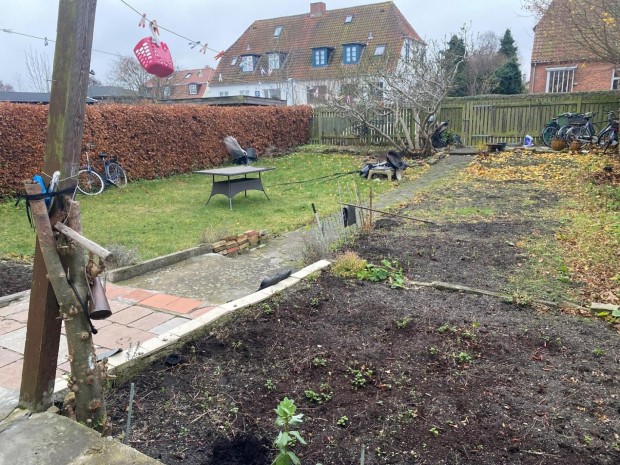 Fra entréen er der udgang til sydvendt have med terrasse. Fliserne fremstod revnede og løse, og der er anlagt køkkenhave.