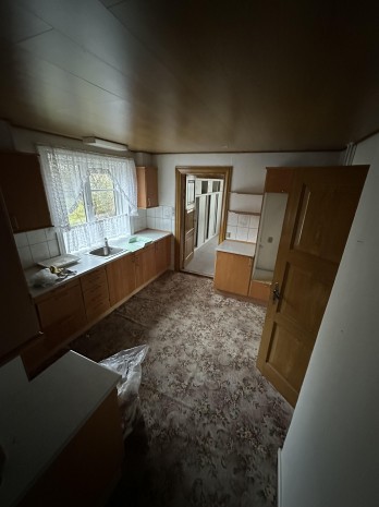 Et af rummene er indrettet med et lille grovkøkken med blå låger i træ og laminatbordplade. Et andet rum er også indrettet med grovkøkken med mørke låger. Et rum er indrettet som værksted. Alle rum i udhuset lugter af fugt.
