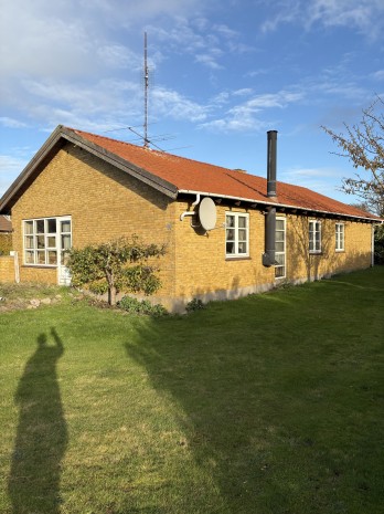 Fra hovedindgangen kommer man ind i entre. 1. dør til højre kommer man ud i et lille køkken. Fra entreen og lige ud kommer man ind i en vinkel-stue med udgang til terrassen foran huset. Ved siden af stuen er et lille værelse og ved siden af dette et lille toilet. Fra den L-formede entre/gang til venstre ligger et lille badeværelt og ved siden af badeværelset er et bryggers med udgang til indkørslen. For enden af den L-formede entre/gange ligger 2 værelser. Fra det ene værelse er der udgang til overdækket terrasse på bagsiden af huset.