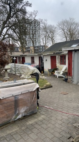 Ejendommen er under renovering, hvorfor bl.a. loft mangler i et værelse samt skabe mv. i køkkenet. Der er anvendt forskellige materialer, herunder fx linoleumsgulv i køkkenet, gulvtæppe i stuen mv.