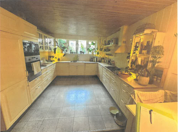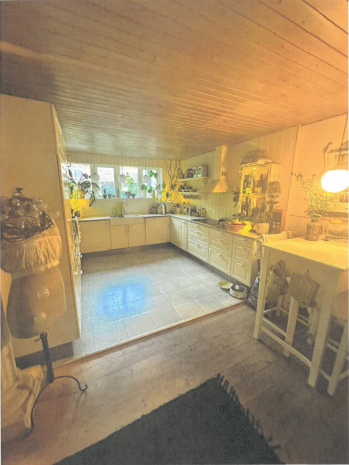 Køkkenet er beliggende til højre for spisestuen. Køkkenet er med lyse melerede klinker samt lyst træloft. Køkkeninventaret har hvide fronter med udskæringer og hvide greb. Køkkenet er udstyret med hvidevarer i form af emhætte, induktionskogeplade, køle-/fryseskab, ovn og opvaskemaskine.