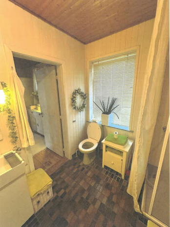 Ved siden af walk-in-closet ligger badeværelset, som har små brunlige fliser som gulvbelægning samt træloft. Badeværelset indeholder bruseniche, grønt badekar, grønt toilet samt håndvask med hvide underskabe.