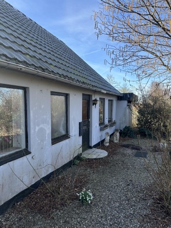 Ved siden af huset, er der en garage med plasttag og udgang for enden til haven.