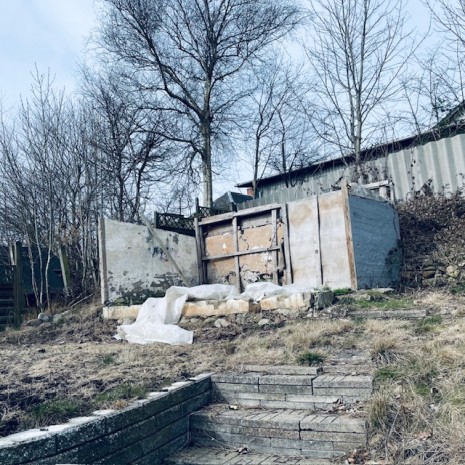 I forbindelse med stuen er en større terrasse og derfra er der adgang til græsplæne. I haven ses en bygning under nedbrydning.