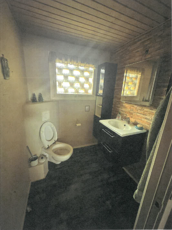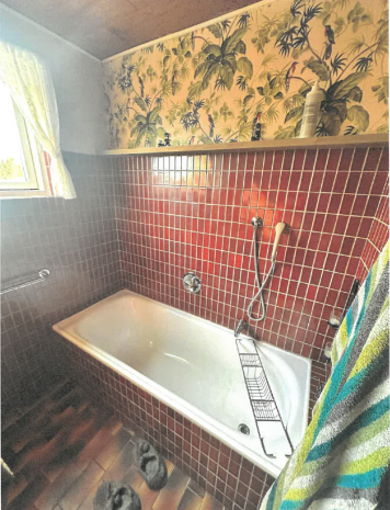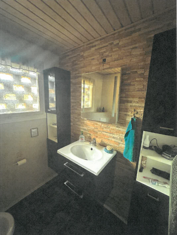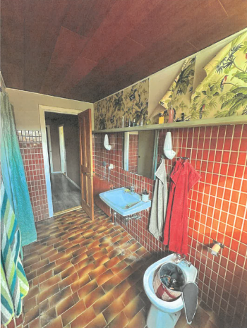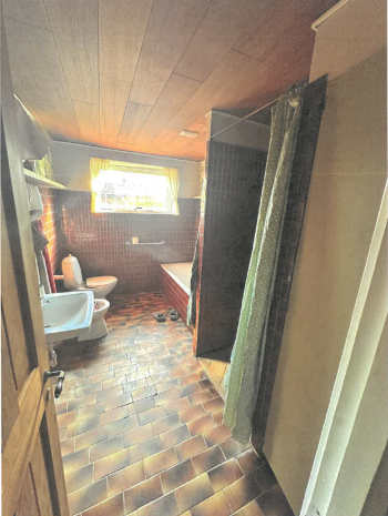 Badeværelset er beliggende i samme ende af huset og er med brunlige fliser på gulv, mørkt træloft og rødbrunlige fliser på vægge. Badeværelset er indrettet med bruseniche, håndvask, bidet, toilet samt badekar.