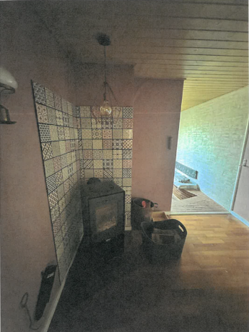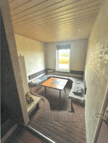 Overfor stuen er en mindre pejsestue, som er indrettet med opmuret bænk. Ved pejsestuen fortsætter en fordelingsgang med gråligt trægulv samt mørkt træloft. Ejendommens sidste tre værelser er placeret langs denne del af fordelingsgangen. Alle værelser er med trægulv samt træloft. Det ene af værelserne har via en terrassedør adgang til den overdækkede terrasse.